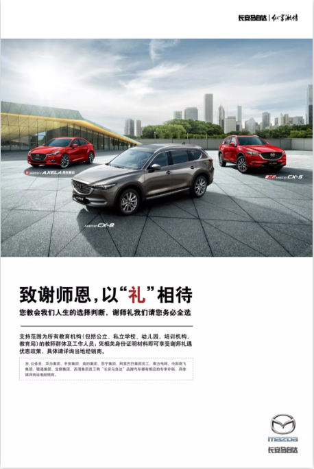 *以上具體優惠請詳詢當地經銷商動,以實際行動表達對靈魂工程師的感恩之情。從7月1日到9月30日,教師攜帶相關職業身份證明至長安馬自達購買相關車型即可享受教師員工專屬優惠。