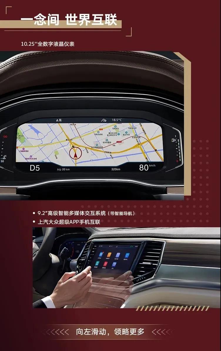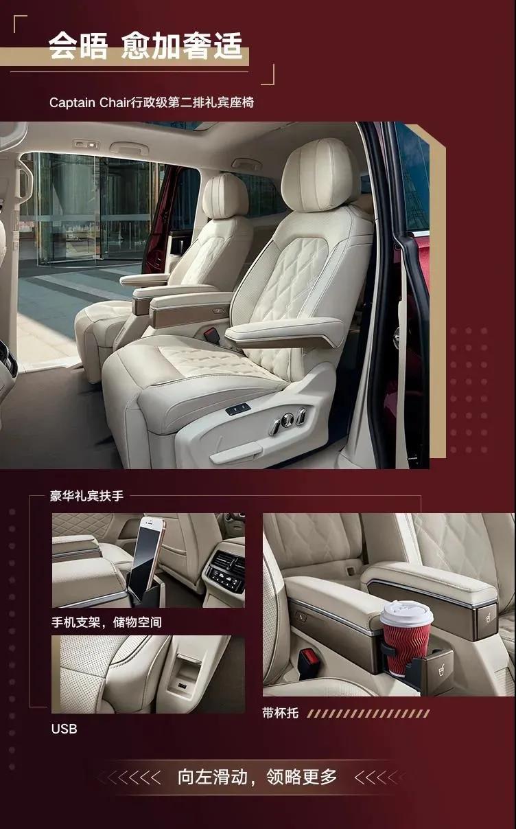 內飾沿用了大眾家族化設計,各功能區規劃整潔簡約。Nappa高級皮質包覆方向盤配有鍍鉻裝飾,9.2英寸Glass Design全玻璃觸控面板和10.2英寸全數字化液晶儀表智能高端。Captain chair行政級奢享第二排座椅,集零重力電動調節、主動通風功能、加熱功能及按摩功能于一身。再加智能雙側防夾電動門和Panorama大尺寸全景天窗,時刻悅享非凡!